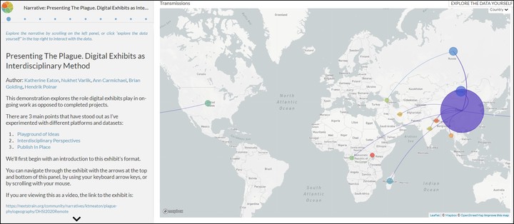 The digital exhibit proposed for the Conference and Colloquium is a NextStrain Narrative. This digital narrative, similar to the StoryMap format, weaves together diverse datasets to drive interactive storytelling. A NextStrain Narrative presents epidemiological data connecting outbreaks (evolutionary trees) alongside maps, timelines, and text descriptions. Specifically, this proposed exhibit presents new interpretations of DNA evidence recovered from plague outbreaks, both past and present. The interactive nature of the exhibit encourages “play” and exploration, inviting new questions to be asked as viewers might, for example, search for spatial and temporal patterns in maps. The ability to simultaneously visualize data generated from different disciplines is a crucial development, as diverse theories are more easily drawn upon to interpret the evidence. It is therefore the intent of this digital demonstration to 1) highlight the work done thus far and seek feedback, and 2) to offer meaningful commentary on the role of digital exhibits not just as scholarly product, but as method in interdisciplinary research.